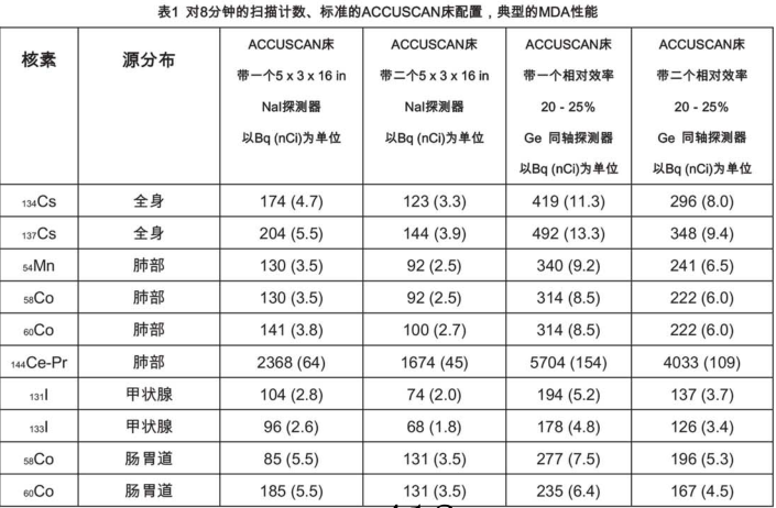 CANBERRA的ACCUSECAN床是一個(gè)完整的交鑰匙全身計(jì)數(shù)系統(tǒng),能在短短5到8分鐘的計(jì)數(shù)時(shí)間內(nèi)識(shí)別和定量人體內(nèi)部的放射性。其設(shè)計(jì)提供在探測(cè)器所有直線(xiàn)方向都屏蔽住的10cm(4in)低本底鋼屏蔽,這一設(shè)計(jì)是為了允許在本底有所升高的區(qū)域中使用而設(shè)計(jì)的。