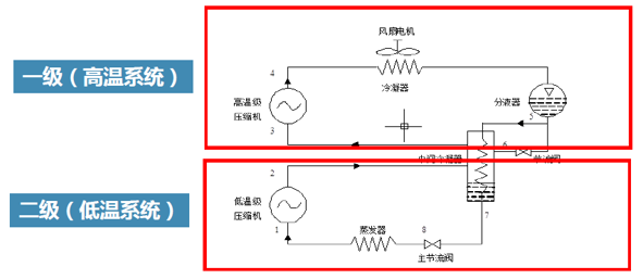 從圖中可看出,雙級復疊制冷系統分別由一級(高溫系統)和二級(低溫系統)組成,其中一級系統的作用是為二級系統的冷凝器降溫,而不是給冰箱內部降溫,是防止二級系統過熱和高壓。
